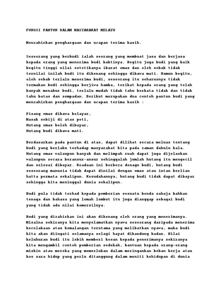 Pantun Melayu sebagai penggambar akal budi orang Melayu. Perbincangan kepentingan pantun sebagai amalan adat istiadat ini mungkin di luar dari maksud pantun budi tetapi ia lebih menjurus kepada konsep sarwajagat universal yang terdapat dalam keseluruhan fungsi pantun yang. Pisang emas dibawa belayar Penegasan kesimpulan kecil.